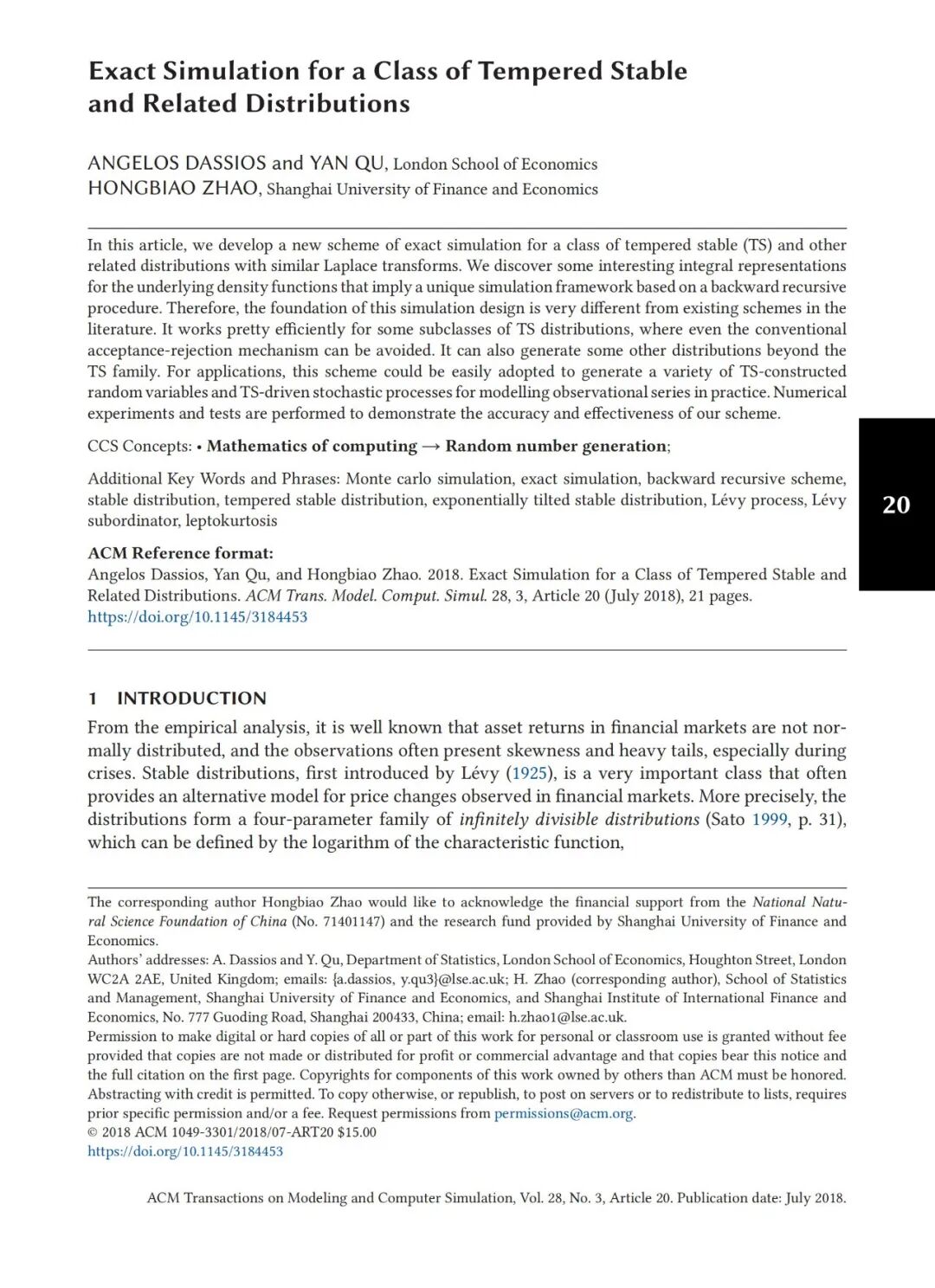 4.Exact Simulation for a Class of Tempered Stable and Related Distributions, 《ACM Transactions on Modeling and Computer Simulation 》