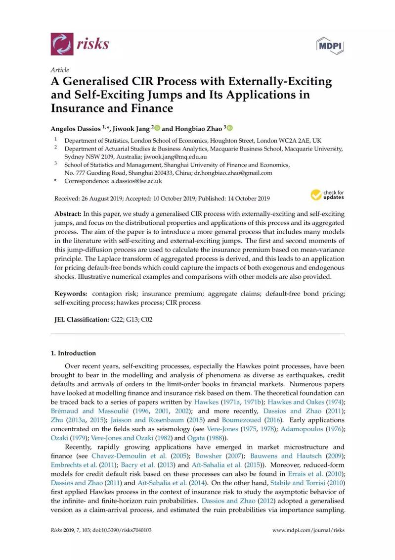 2.A Generalised CIR Process with Externally-Exciting and Self-Exciting Jumps and Its Applications in Insurance and Finance, 《Risks》