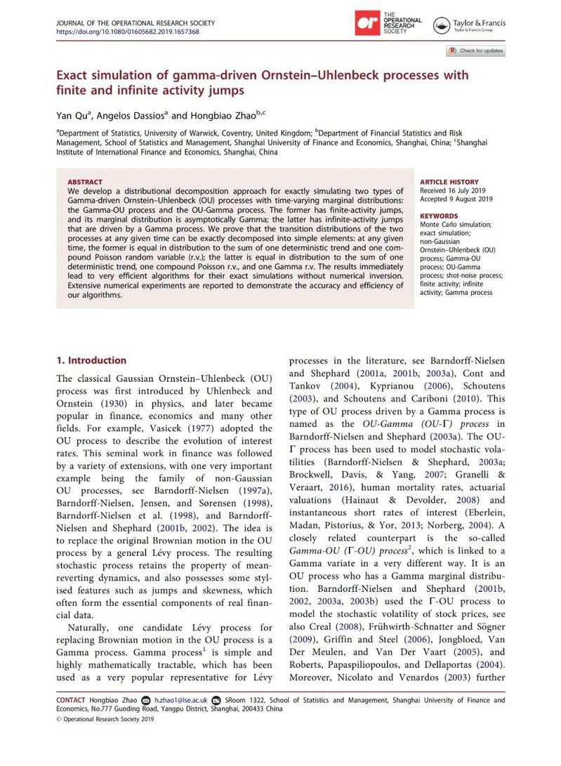 3.Exact Simulation of Gamma-driven Ornstein-Uhlenbeck Processes with Finite and Infinite Activity Jumps,《Journal of the Operational Research Society》