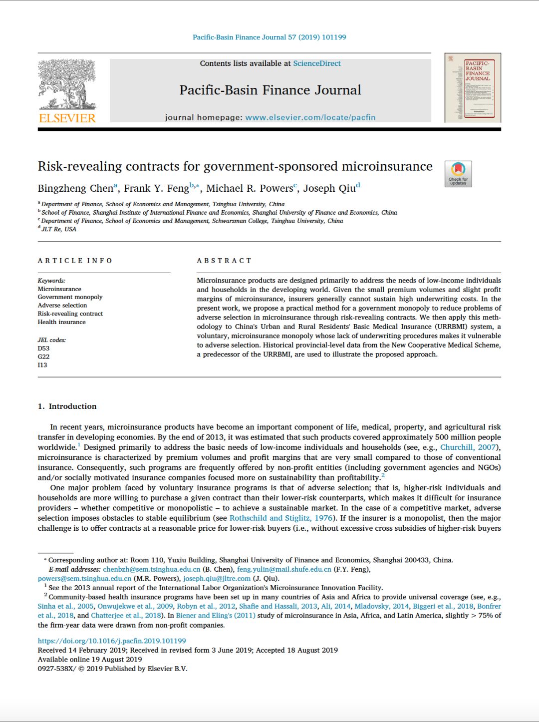 1. Chen, Bingzheng, Frank Y. Feng, Michael R. Powers, and Joseph Qiu. Risk-revealing contracts for government-sponsored microinsurance. Pacific-Basin Finance Journal, 2019, 57: 101-199.