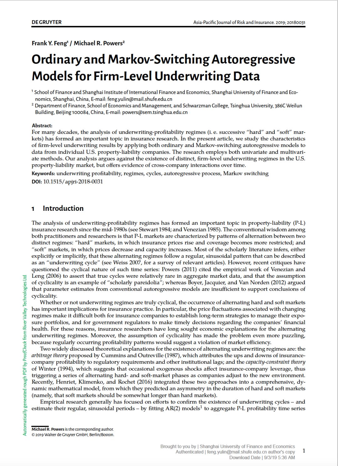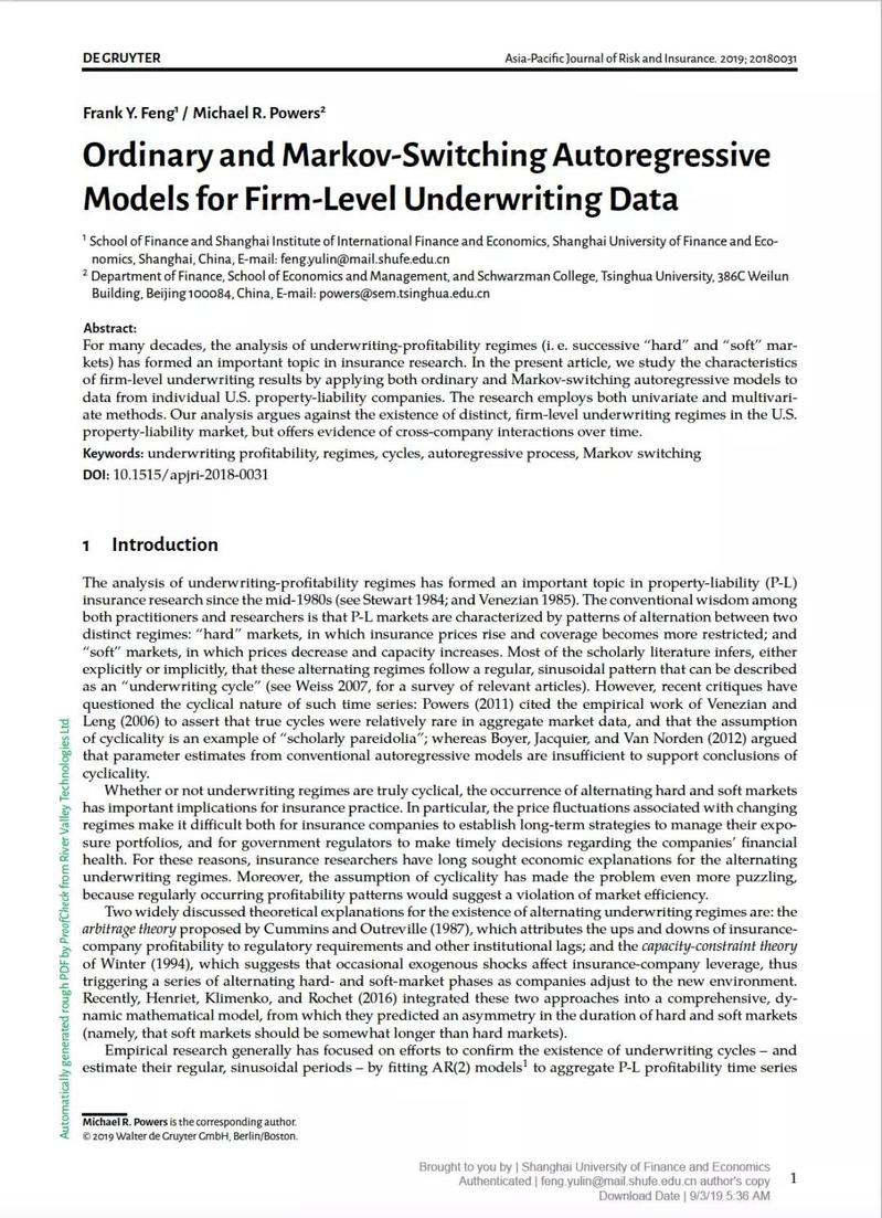 2. Feng, Frank Y., and Michael R. Powers. Ordinary and Markov-Switching Autoregressive Models for Firm-Level Underwriting Data. Asia-Pacific Journal of Risk and Insurance, 2019, 13(2): 1-16.