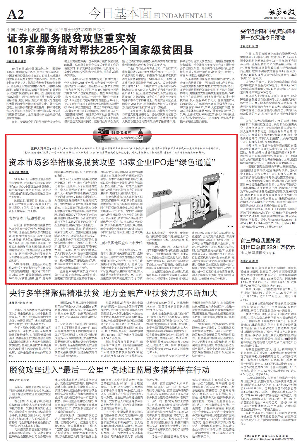 10月14日,由中国证监会主办的国家扶贫日“资本市场脱贫攻坚论坛”在京举办。近年来,我国资本市场在脱贫攻坚战中一直发挥着积极独特的作用,包括“绿色通道”政策、“一司一县”结对帮扶、以及加大对“三农”和扶贫等领域的支持力度等。2016年9月出台《中国证监会关于发挥资本市场作用服务国家脱贫攻坚战略的意见》,对贫困地区企业在首发上市、新三板挂牌、发行债券等方面开辟绿色通道,做到“即报即审、审过即发”。
