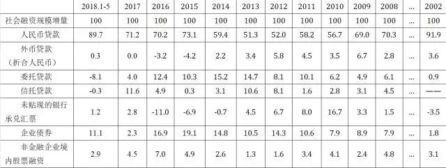 今年5月,社会融资规模增量为7608亿元,比上年同期少3023亿元。其中,委托贷款减少1570亿元,同比多减1292亿元;信托贷款减少904亿元,同比多减2716亿元;未贴现的银行承兑汇票减少1741亿元,同比多减496亿元。也就是说,表外融资合计减少4215亿,同比多减4504亿元。这是造成5月当月社会融资规模增量同比下降的最主要原因。从表2的社融增量结构看,今年1-5月,委托贷款和信托贷款在社会融资规模增量中的占比则分别为-8.1%和-0.3%,未贴现的银行承兑汇增量仅占1.2%,分别较2017年末下降12.1、11.9和1.6个百分点。