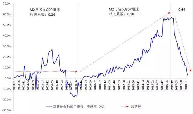 考察M2增速与名义GDP增速的相关系数可以发现,2008年以前,银行主要通过传统信贷方式向实体经济提供资金支持,M2增速与GDP增速相关系数为0.24。2008年之后,银行对其他金融部门债权的同比增速从2008年4月的-10.1%逐步上升到2016年2月的79.6%,股权及其他投资的同比增速也在2016年2月达到最高点116.6%,此期间M2与GDP增速的相关系数降至0.18。随着最近一两年来的金融去杠杆,银行对其他金融部门债权增速逐步下降,金融体系内部资金流转压缩,资金更多地直接流向实体经济,使得M2与经济增长的相关性提高。2017年初至2018年3月,M2与名义GDP增速的相关系数上升至0.64。