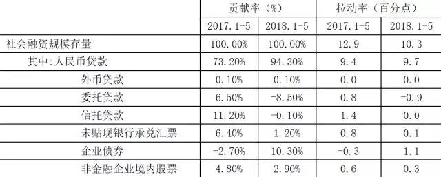 表3测算了各项目对社会融资规模变动的贡献率和拉动率。委托贷款、信托贷款和未贴现银行承兑汇票等表外融资的萎缩是社融增量下降的主要原因。上述三项指标在2017年1-5月对社会融资规模的拉动率分别是0.8%、1.4%和0.8%,而2018年1-5月则分别降至-0.9%,0.0%和0.1%。5月当月,尽管企业债券融资净减少,但与去年同期相比少减2504亿元,企业债券融资对社会融资规模的拉动率反而上升。2017年1-5月,企业债券将社会融资规模增速拉低了0.3个百分点,而今年1-5月则提高社会融资规模增速1.1个百分点。