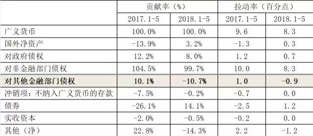 金融强监管的过程中,去杠杆、减通道压缩了银行投放非银的资金,减少了资金在金融体系内部的空转,缩短了资金链条,资金大量回表,同时提高了金融市场利率。表内贷款更多地受到资本充足率等监管指标的约束,资金投放更加透明,有利于防范风险。但这同时也在一定程度上导致融资渠道减少,尤其是中小企业的融资可能受到冲击。最新数据显示,今年1-5月,对非金融部门债权拉动M2增速8.3个百分点,而上年同期是10.0个百分点,也就是说,随着金融强监管的持续深入,实体经济的融资也受到了一定影响,从表1可见,这一因素也使M2增速较上年同期回落1.7个百分点。