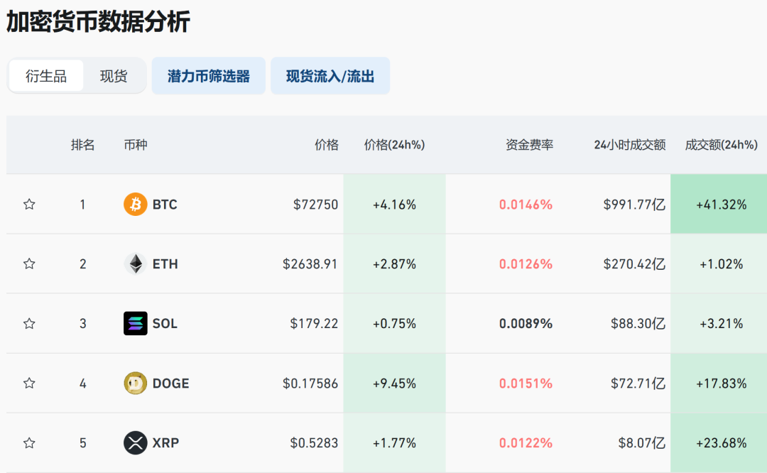 截至10月30日8:23分,比特币价格报72750美元,其他加密货币集体大涨。