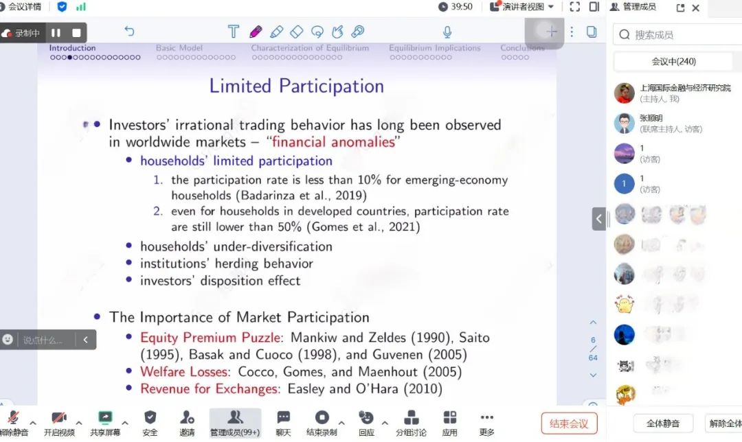 张教授教授在讲座中指出,传统金融理论中投资者通常认为资产的收益分布及相关性是确定的,而该研究通过引入相关性模糊的假设,分析投资者如何在不确定环境中进行投资决策。在模型中,投资者被分为“复杂型投资者”和“朴素型投资者”,其中朴素型投资者在决策过程中倾向于规避相关性的不确定性。张教授通过模型分析揭示了不同投资者在均衡条件下的投资策略差异。结果表明,朴素型投资者在应对相关性模糊时,通常选择有限的市场参与,这一行为使其与复杂型投资者在投资策略上产生显著差异。同时,研究发现,朴素型投资者的市场参与程度受到多种因素的影响,包括市场中朴素型投资者的比例以及他们对资产收益之间相关性的模糊认知水平。该研究不仅扩展了现有的金融市场均衡定价理论,还为理解投资者在不确定性下的行为提供了新视角。张教授指出,这一发现对政策制定具有深远影响,因为朴素型投资者的参与行为将影响市场的流动性和资产价格的形成。