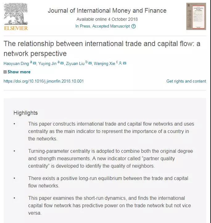 上海国际金融与经济研究院创新团队靳玉英教授与丁浩员副教授及其他两位合作者的论文“The relationship between international trade and capital flow: a network perspective”被国际金融著名期刊Journal of International Money and Finance接受发表。