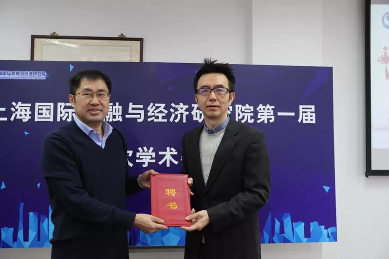 蒋校长致辞结束,研究院院长刘莉亚教授宣读上海国际金融与经济研究院学术委员会增补名单,分别是钱军教授、罗长远教授、赵晓菊教授、冯芸教授,蒋传海校长为增补委员颁发聘书并合影留念。
